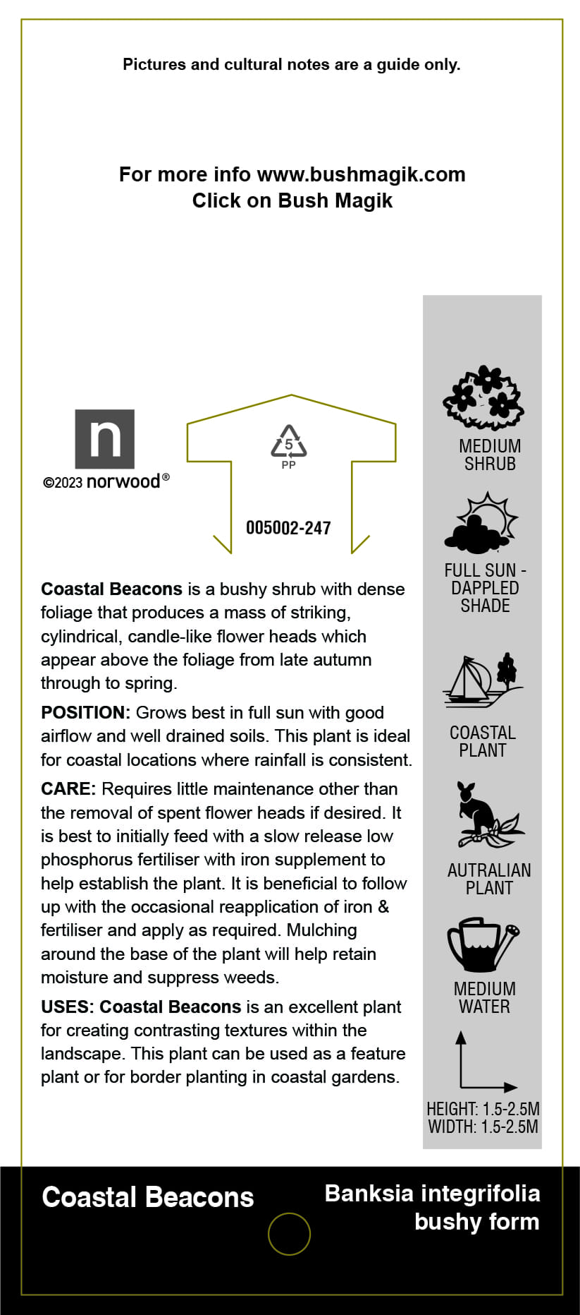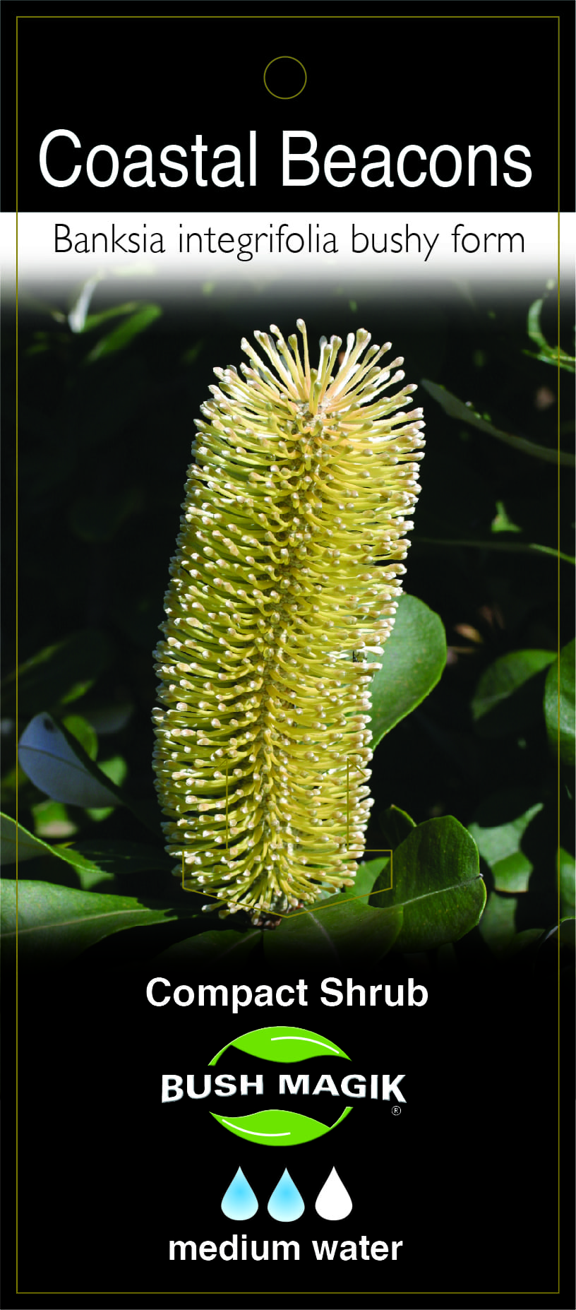 Banksia integrifolia Bushy form 'Coastal Beacons' - Label