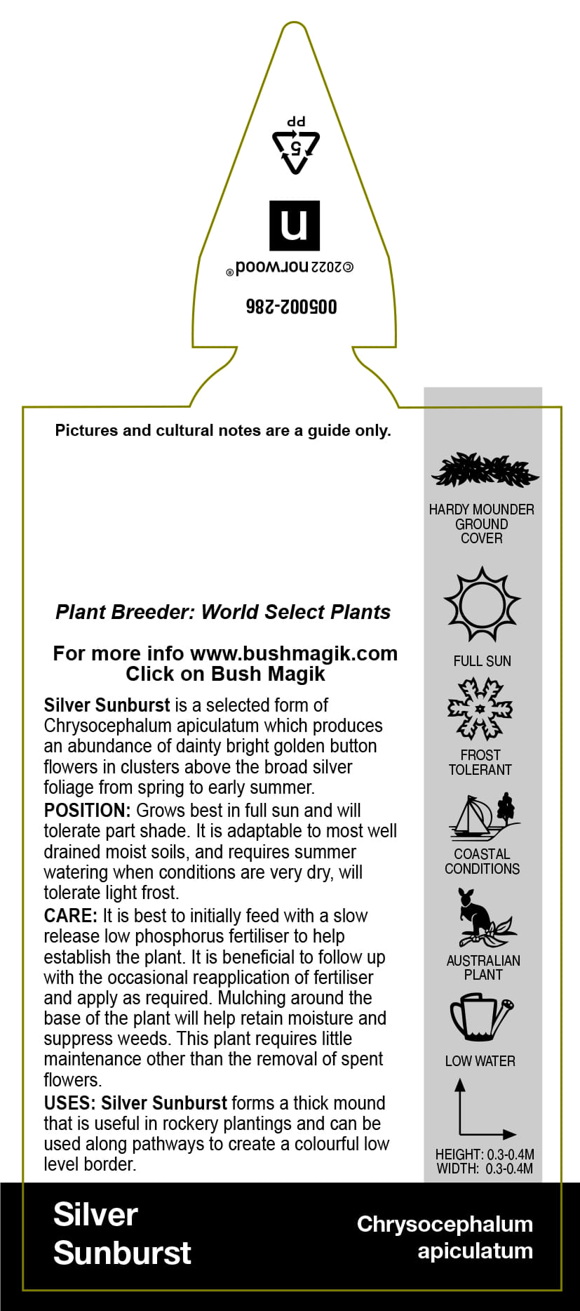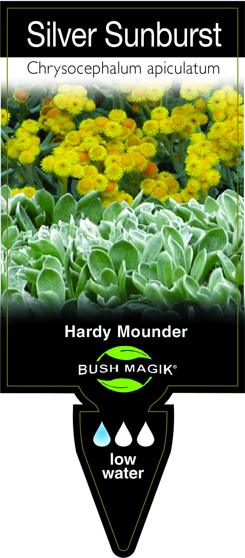 Chrysocephalum apiculatum 'Silver Sunburst'- Label