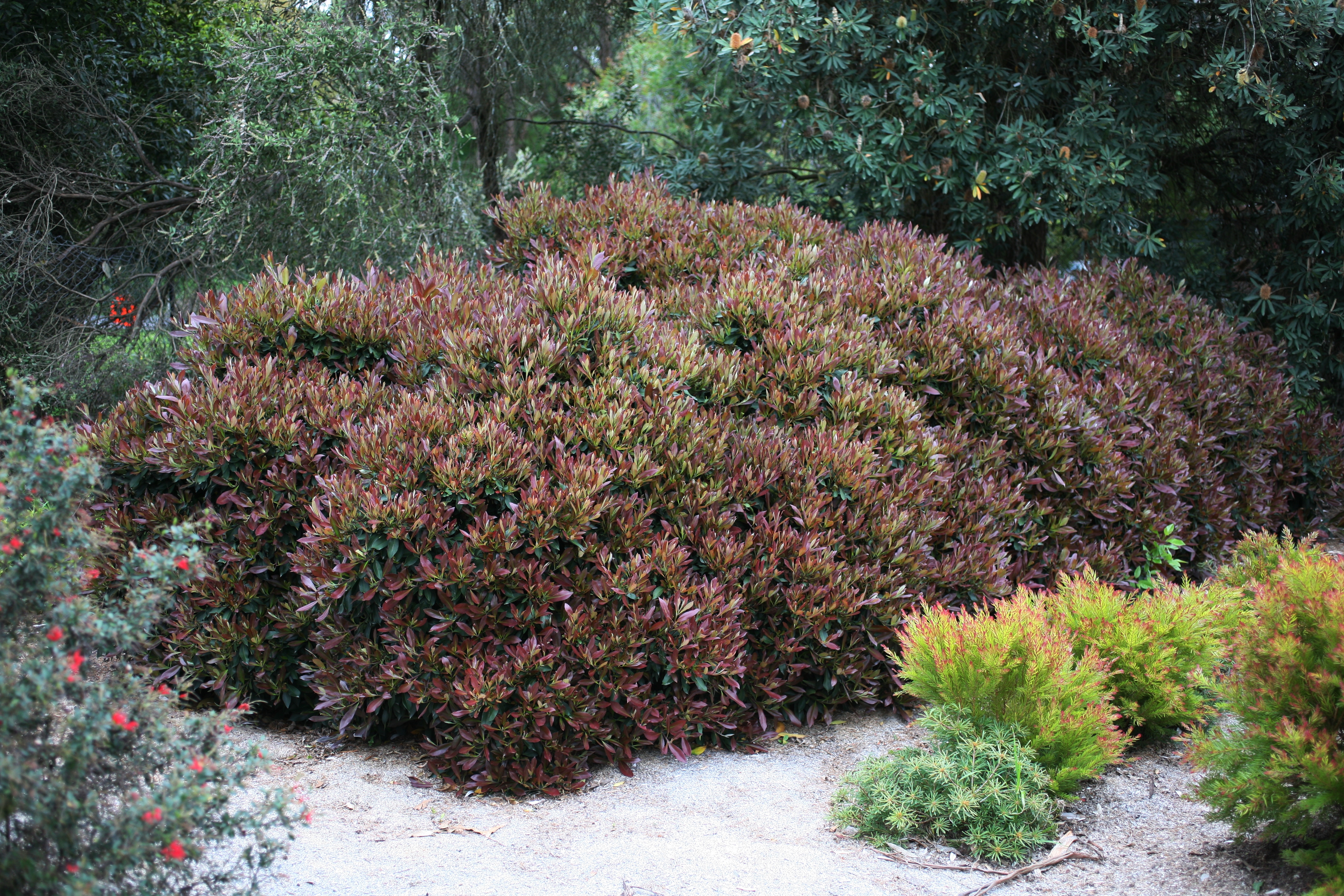 BurgundyBlush is a selected dwarf form of Tristaniopsis laurina. It is an evergreen shrub with rich red foliage from winter to spring. This plant is compact in habit making it suitable for any garden that requires low structured plantings and little maintenance. Burgundy Blush attractive rich red foliage and compact habit makes a stunning low to medium hedge and is the native alternative to Photinia robusta. Tristaniopsis laurina the tree is commonly known as Water Gum and Luscious. |