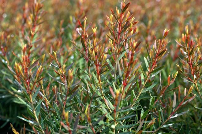 Mini Mel is a dwarf evergreen shrub that naturally forms a round dense ball. The new growth is smokey reddish / bronze colour, and this small shrub emits a rich aroma when crushed. Mini Mel is selected from Melaleuca linariifolia which is a tree commonly known as Narrow-Leaved Paperbark, Flax-Leaved Paperbark and Snow In Summer. The other most similar dwarf varieties are Melaleuca Little Red, Melaleuca Claret Top which can be mix planted with Melaleuca Mini Mel to create contrast. |